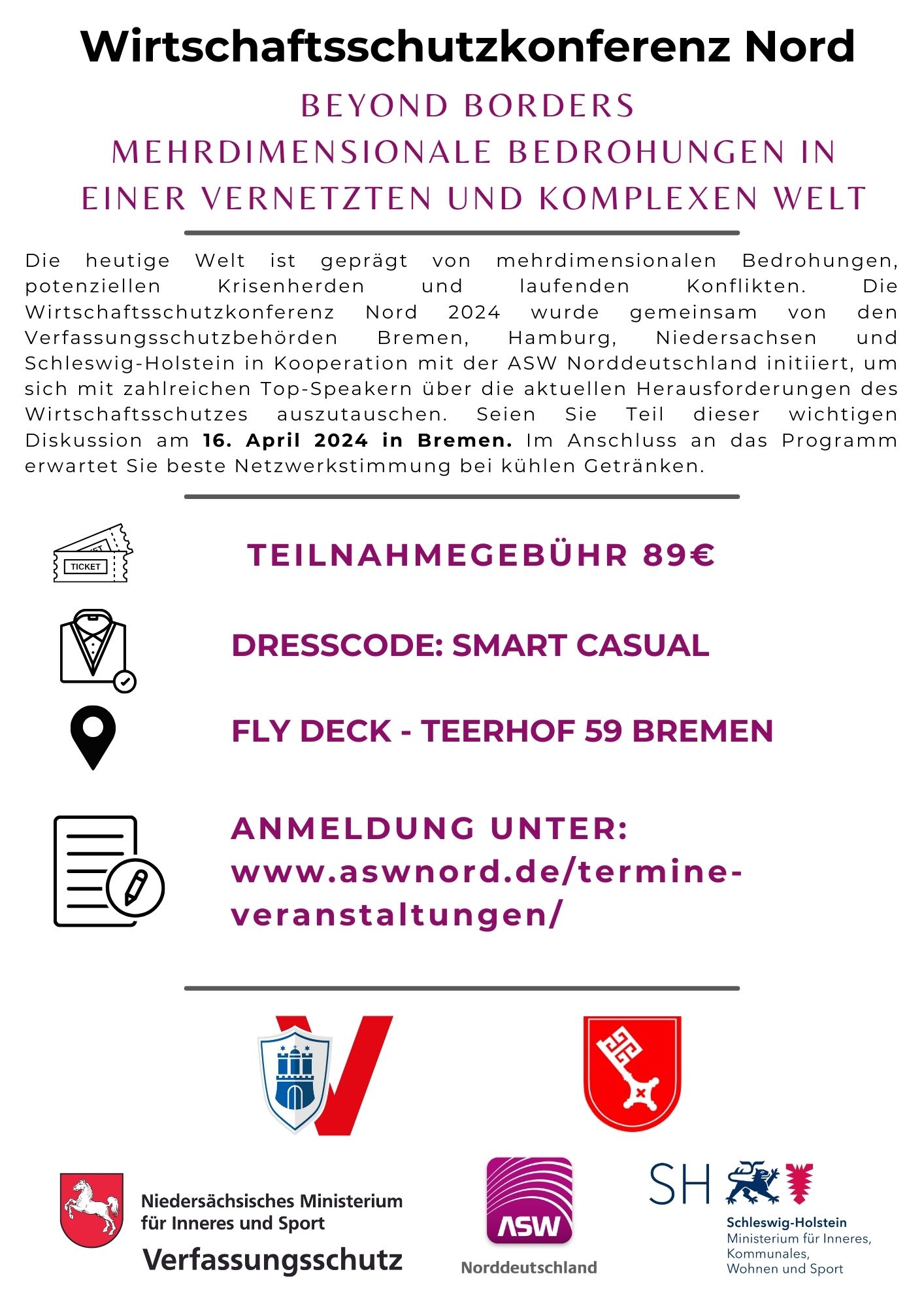 Die heutige Welt ist geprägt von mehrdimensionalen Bedrohungen, potenziellen Krisenherden und laufenden Konflikten. Die Wirtschaftsschutzkonferenz Nord 2024 wurde gemeinsam von den Verfassungsschutzbehörden Bremen, Hamburg, Niedersachsen und Schleswig-Holstein in Kooperation mit der ASW Norddeutschland initiiert, um sich mit zahlreichen Top-Speakern über die aktuellen Herausforderungen des Wirtschaftsschutzes auszutauschen. Seien Sie Teil dieser wichtigen Diskussion am 16. April 2024 in Bremen. Im Anschluss an das Programm erwartet Sie beste Netzwerkstimmung bei kühlen Getränken.